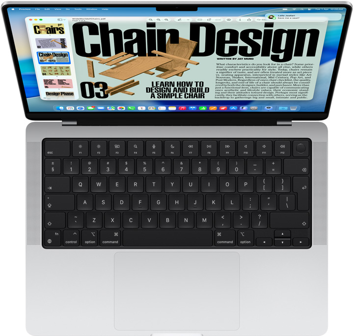 With Continuity Camera, you can take a photo with your iPhone and instantly see it in an email on your Mac. Or scan a receipt with your iPhone and see it appear in Messages — automatically cropped, straightened, and ready to share. Continuity Camera works with lots of apps, including Notes, Pages, and Keynote. It’s another way iPhone and Mac just click. Continuity Camera also unlocks new capabilities for Zoom calls. You can share a top-down view of your workspace with Desk View. And Center Stage keeps you in the picture if you move around during your call.