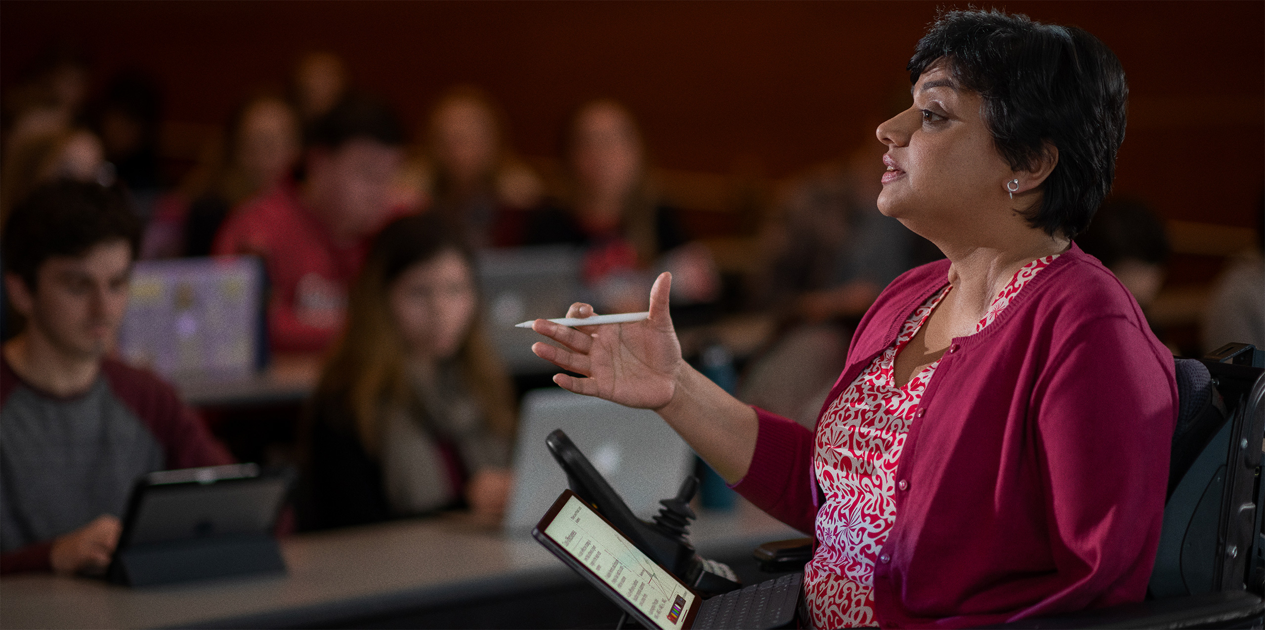 A tecnologia Apple transforma a sala de aula em um espaço dinâmico de ideias. A Dra. Gopalakrishnan utiliza recursos integrados de acessibilidade do iPad Pro, como Ditado e AssistiveTouch, para interagir e ilustrar conteúdo em tempo real. Já o Apple Pencil é uma ferramenta interativa completa para rascunhar, desenhar e fazer marcações.
