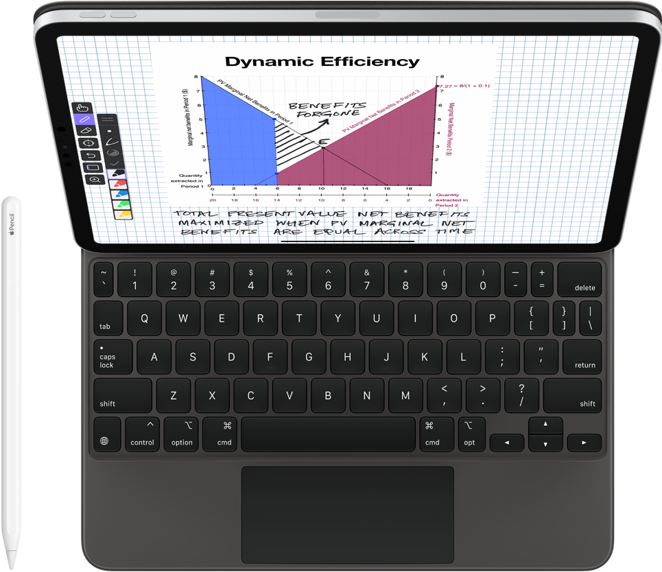 iPad Pro e Apple Pencil. Com o Explain Everything Whiteboard no iPad, a Dra. Gopalakrishnan registra e grava suas aulas de economia ambiental, detalha gráficos e diagramas abstratos e demonstra aos alunos como resolver problemas matemáticos complexos em tempo real.