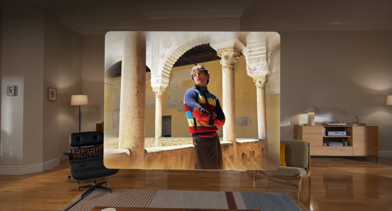 Les scènes spatiales transforment les images et les expériences visuelles en leur conférant une profondeur réaliste. On peut les voir dans Photos, Safari et Galerie spatiale – et dans les apps de tiers, qui peuvent aussi les intégrer.