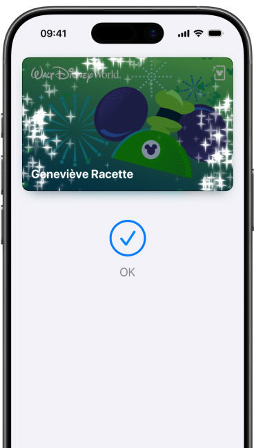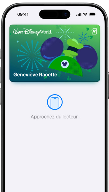 Si vous avez déjà ajouté une carte de crédit, carte de débit ou carte de fidélité compatible avec Apple Pay dans Portefeuille, double-cliquez sur le bouton principal pour ouvrir l’app, puis approchez votre appareil du lecteur. Sur