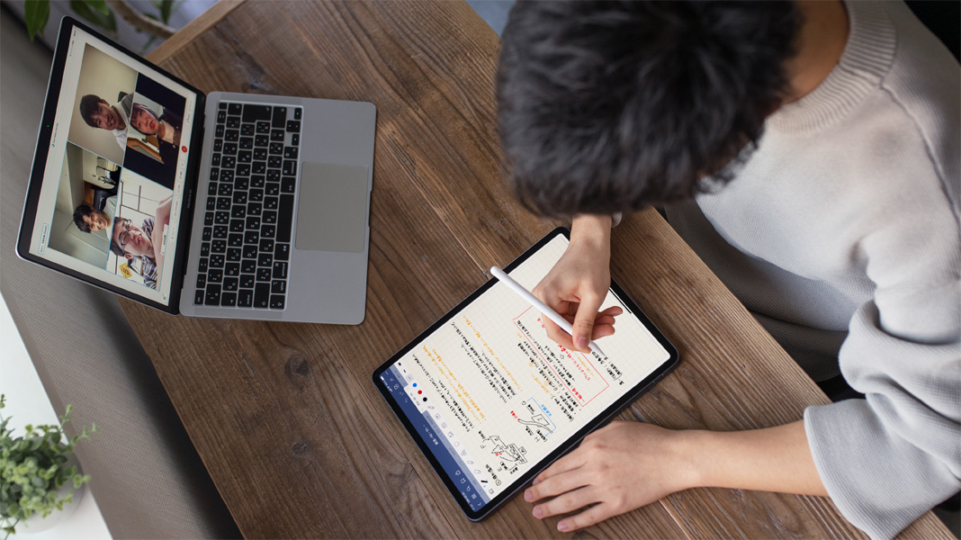 Wie viele andere Studierende hat sich auch Takuto an das Lernen zu Hause gewöhnt, indem er die Vorteile modernster Technologie nutzte. Bei Online-Vorlesungen verwendete er Split Screen auf dem iPad, um auf der einen Seite des Bildschirms die Präsentationen der Professor:innen zu sehen und auf der anderen Notizen zu machen. Und in virtuellen Lerngruppen nutzte er FaceTime auf dem Mac, um sich mit Kommiliton:innen auszutauschen, während er Gruppenprojekte auf der immersiven Oberfläche des iPad festhielt.