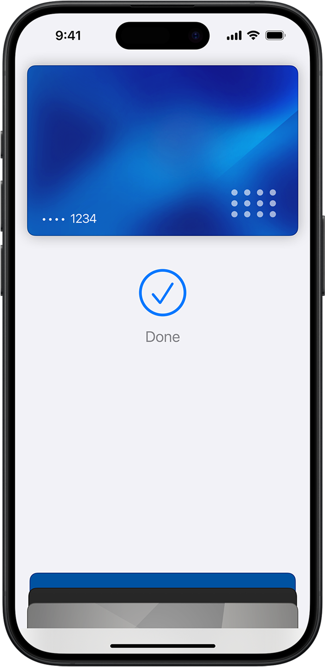 Prêt en quelques secondes. Apple Pay est très simple à confi­gurer. Il vous suffit d’ajouter vos cartes de crédit ou de débit dans l’app Cartes de votre iPhone, et c’est parti. Vous continuez bien sûr à bénéficier des points, miles et autres avantages associés à vos cartes.