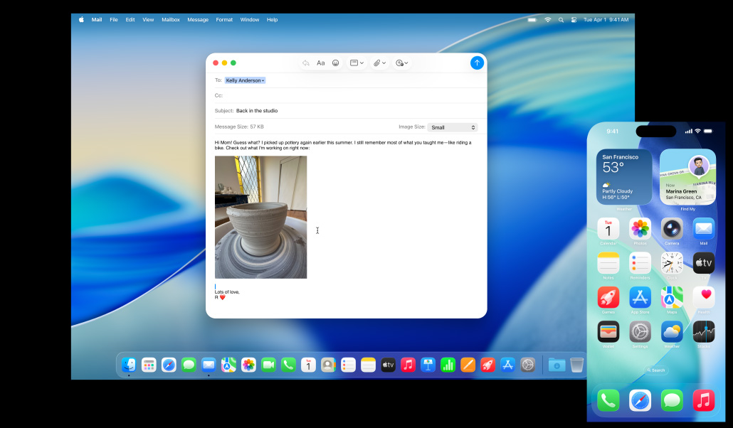El Mac, el iPhone, el iPad y el Apple Watch ya son increíbles por su cuenta. Pero al usarlos juntos, se lucen mucho más. Gracias a Continuidad, tus dispositivos trabajan en equipo con total fluidez para que puedas acceder a un mundo de funcionalidades espectaculares. Empieza a escribir un email en tu Mac y termínalo en el iPad. Saca una foto en tu iPhone para verla al instante en el Mac. O haz llamadas sin tener que usar el iPhone.1 Todo gracias a Continuidad.