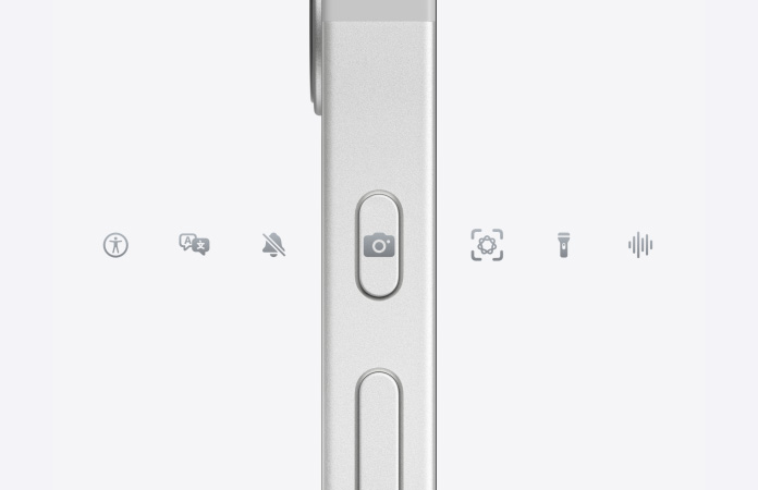 iPhone 17e, přední strana se Ceramic Shieldem 2, pohled z boku, bílá barva, akční tlačítko, tlačítka ovládání hlasitosti