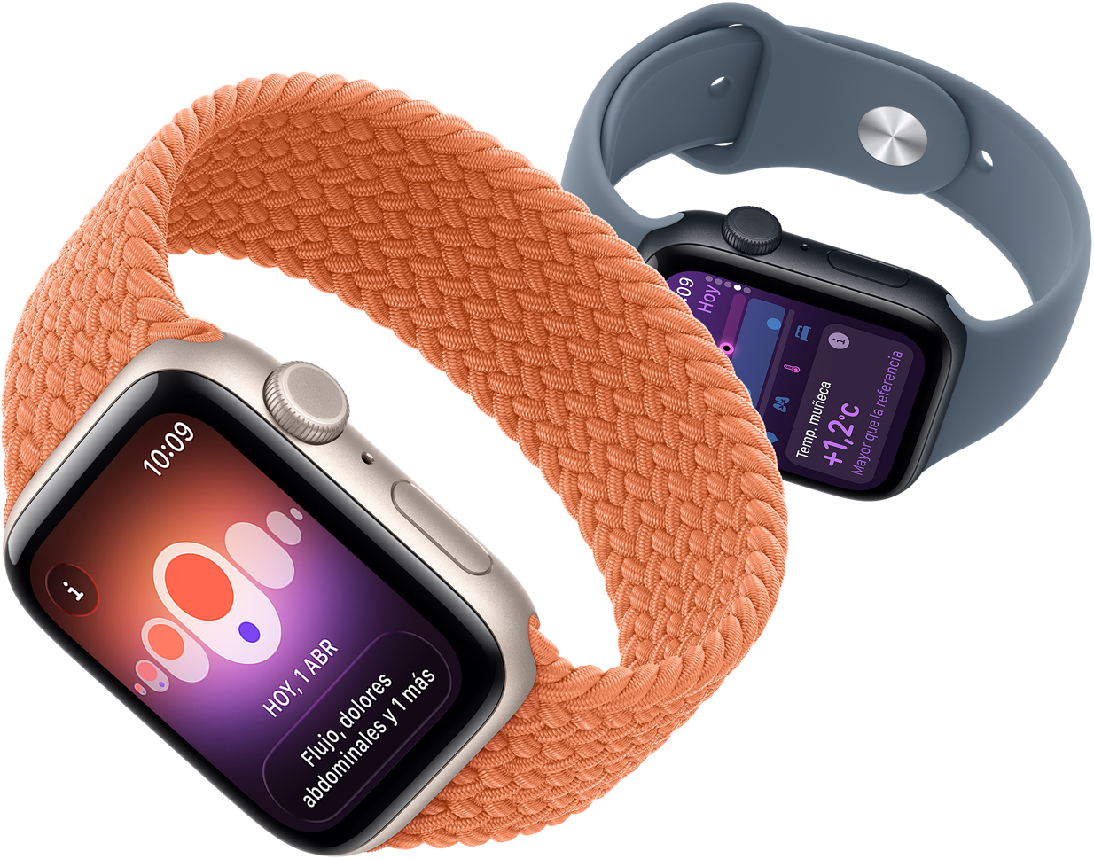 Modelos de Apple Watch SE 3, cajas de aluminio, color blanco estrella y medianoche, pantallas: app Constantes Vitales, app Frecuencia Cardiaca, Calidad del Sueño, anillos de Actividad, llamada entrante