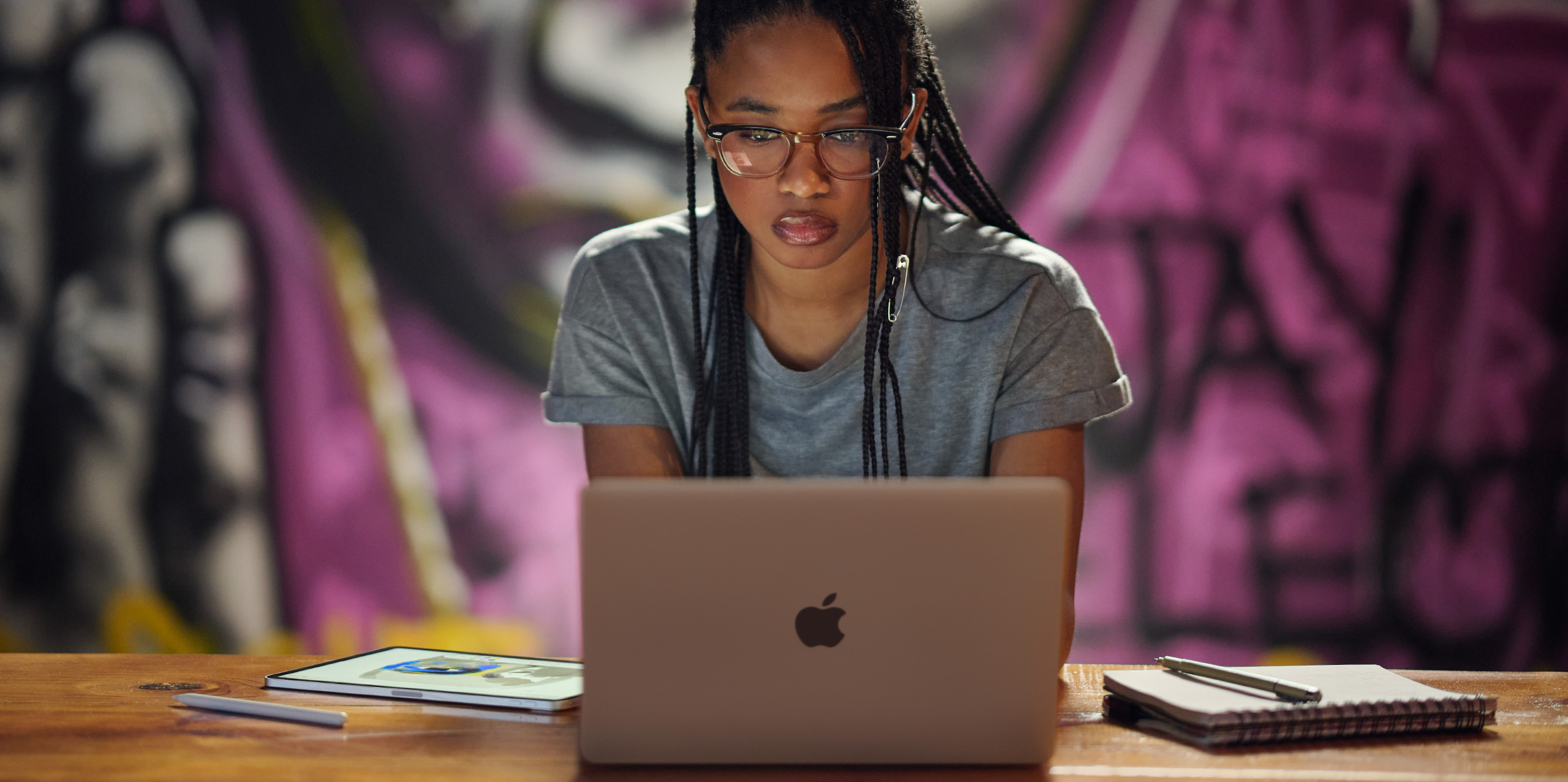 Miya a récemment participé en tant que réalisatrice au programme Beats Black Creators, qui réunit des étudiantes et étudiants des universités historiquement noires (HBCU) de tous les États‑Unis et les invite à faire travailler leur imagination, à se tourner vers l’avenir et à collaborer sur un film. C’est dans ce cadre qu’elle a mis en œuvre son workflow préféré sur Mac, composé de l’app Celtx Script pour l’écriture, de l’app Pitch pour les traitements et de Notes sur iPad pour la production. « Dès que je crée, il faut avant tout que je veille à m’organiser. Les produits Apple se chargent de rationaliser le processus créatif », confie Miya.