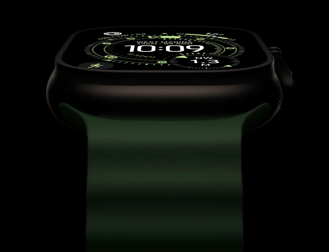 Apple Watch Ultra 3,採用原色鈦金屬錶殼,配以霓虹綠色海洋錶帶,螢幕顯示定向運動錶面的指南針