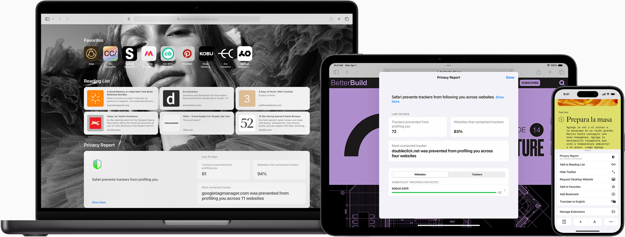 Safari makes it simple to see how your privacy is protected on all the websites you visit. Click Privacy Report in the Safari menu for a snapshot of cross-site trackers currently prevented from profiling you on the website you’re visiting. Or view a weekly Privacy Report to see how Safari protects you as you browse over time.