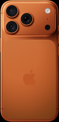 Spalvos. Rinkis iš trijų įspūdingų spalvų. Rodomas kosminės oranžinės spalvos „iPhone 17 Pro“.