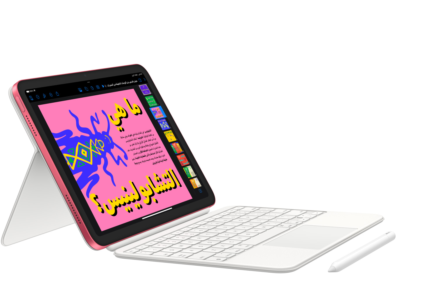 ارسم ولوّن ودوّن بقلم Apple. ومع المحفظة بلوحة مفاتيح ماجيك متعددة الاستعمالات والمصممة من قطعتين، يمكنك الاسترسال في الطباعة واستخدام لوحة التعقب والاستمتاع بمشاهدة كل ما تريد على راحتك.2 ويمكنك أيضاً الاستعانة باختصارات لوحة المفاتيح التي تعرفها وتحبها، أو النقر أينما تشاء على لوحة التعقب. إنها تجربة طباعة مذهلة بالطبع.