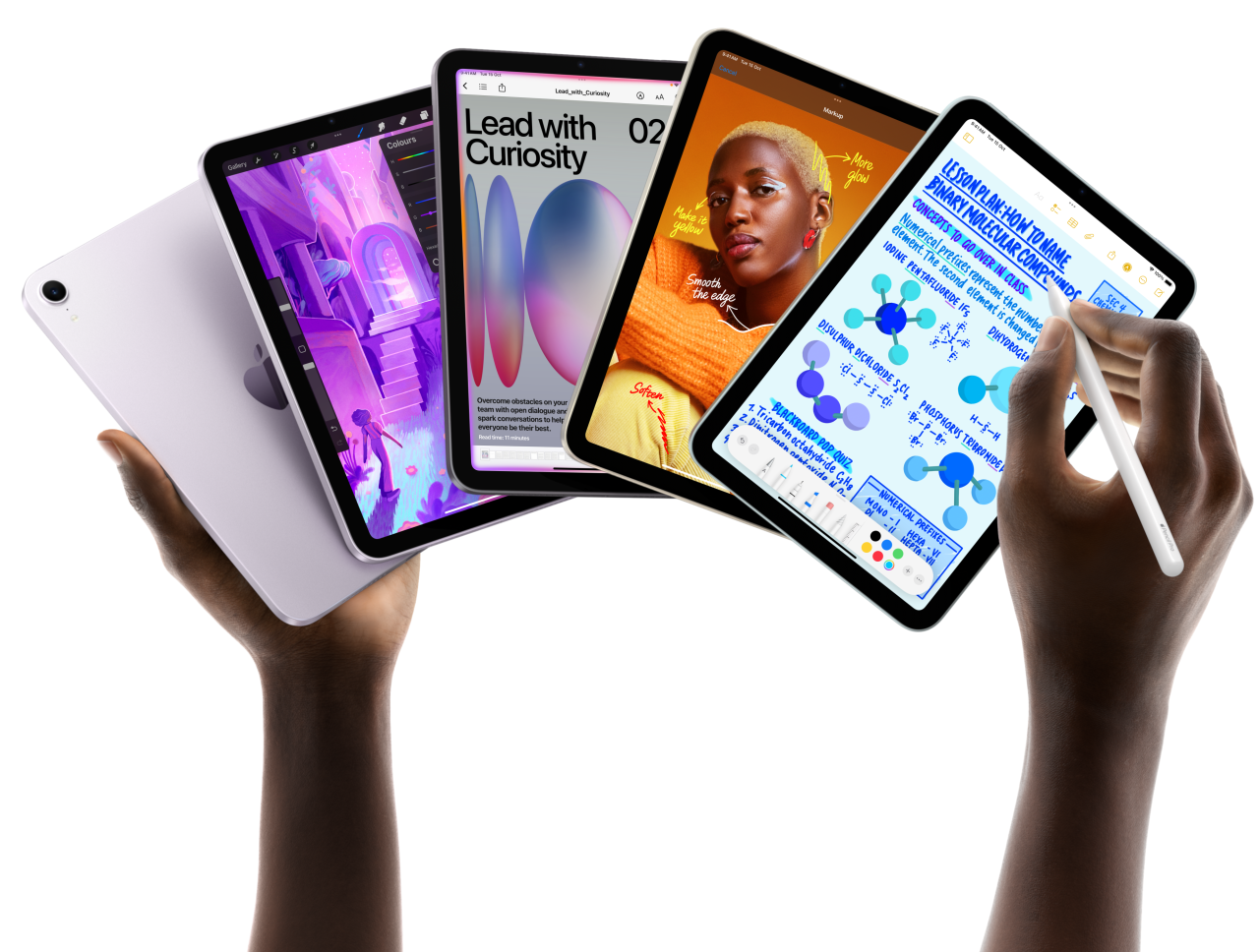 Five iPad mini models are shown in a fan formation held by a user’s hands. One model shows the back camera, the other four are front facing. Apple Pencil Pro is being used to take notes.