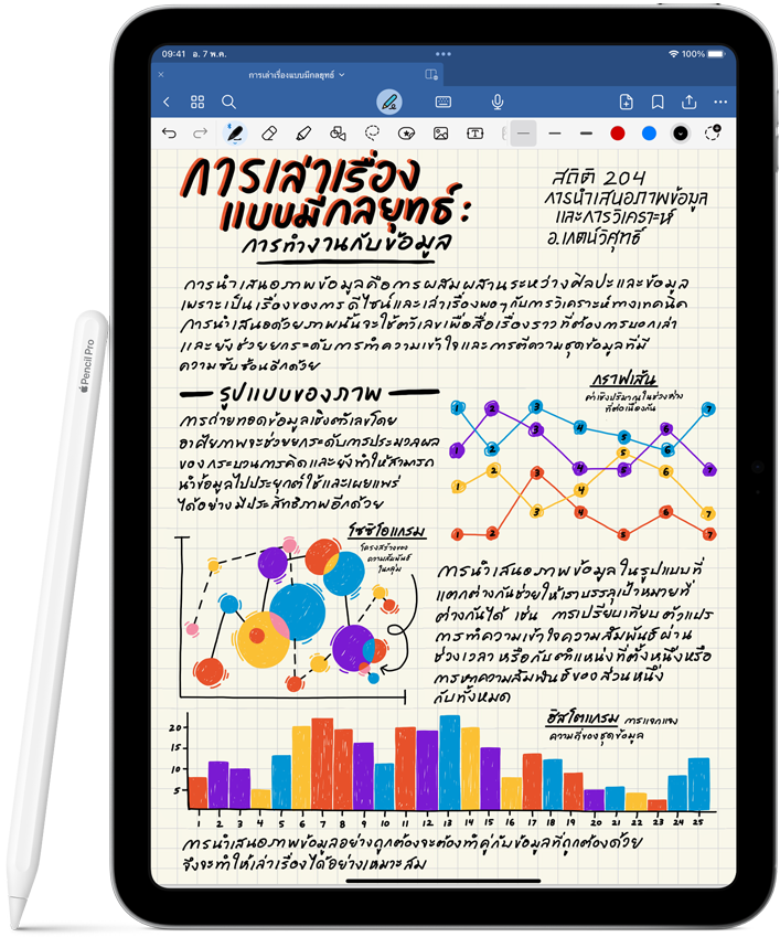 รูปภาพของ Apple Pencil Pro และ Apple Pencil USB-C ที่อยู่ถัดจาก iPad หลายเครื่อง ซึ่งแสดงให้เห็นตัวอย่างของโน้ตที่เขียนด้วยลายมือและภาพประกอบสีสันสวยงามที่สร้างสรรค์ขึ้นด้วย Apple Pencil