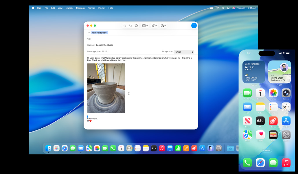 iPhone 16 Plus ที่มีแอปกล้องเปิดอยู่และกำลังจัดเฟรมภาพหม้อเซรามิก, MacBook Air รุ่น 13 นิ้ว ที่มีแอปเมลที่เปิดอยู่ และกำลังร่างอีเมลพร้อมรูปที่ถ่ายจาก iPhone