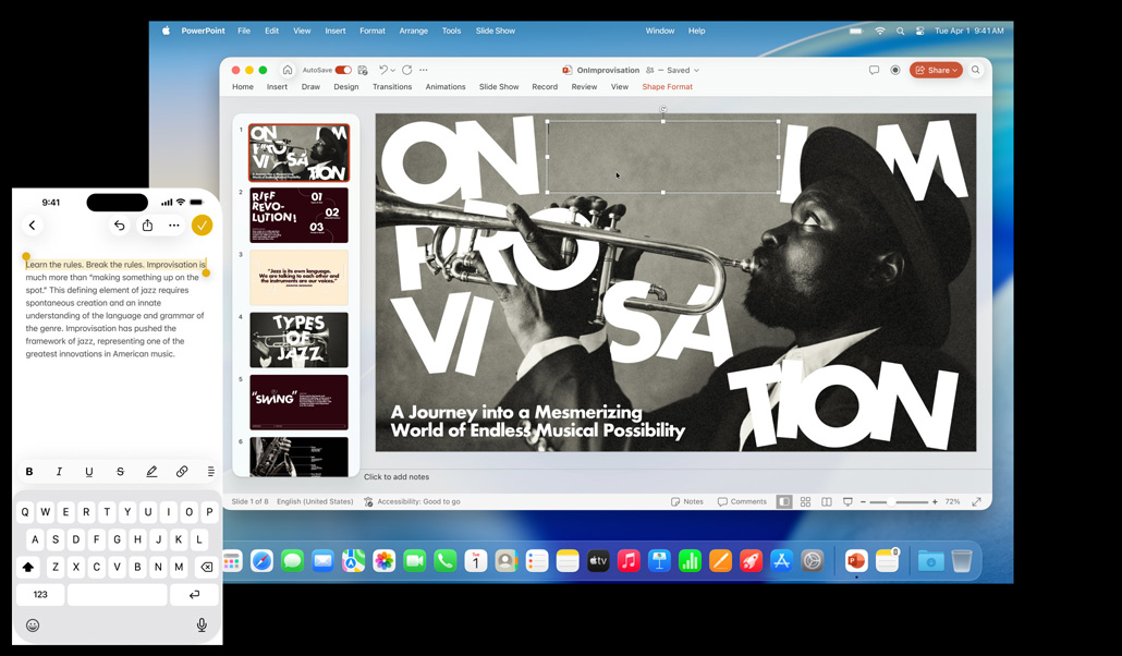 iPhone 16 Plus ที่มีข้อความไฮไลท์อยู่ในแอปโน้ต, MacBook Air รุ่น 13 นิ้ว ที่มีสไลด์ Keynote เปิดอยู่โดยมีข้อความจากแอปโน้ตปรากฏอยู่บนสไลด์