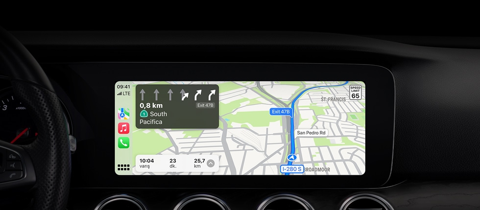 CarPlay, direksiyon başında olduğunuzda da Harita’nın gücünden ve basitliğinden yararlanabilmenizi sağlıyor. Mail’lerinizdeki adresler, metin mesajları, kişiler ve takvimler gibi aygıtınızda sakladığınız verilere dayalı olarak size akıllı önerilerde bulunabiliyor. Üstelik, ayrıntılı harita ve sokak sokak sesli yol tarifleriyle gitmeniz gereken yere ulaşmanız da her zamankinden kolay hale geliyor.