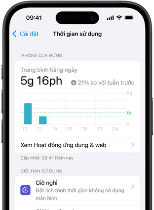 Thời Gian Sử Dụng giúp bạn biết rõ hơn về thời gian bạn và các con mình dùng các ứng dụng, truy cập các trang web cũng như tổng quan về việc sử dụng thiết bị của bạn. Bạn có thể nhận báo cáo hàng tuần hoặc xem thói quen sử dụng một số ứng dụng cụ thể, thông báo và tần suất cầm thiết bị.